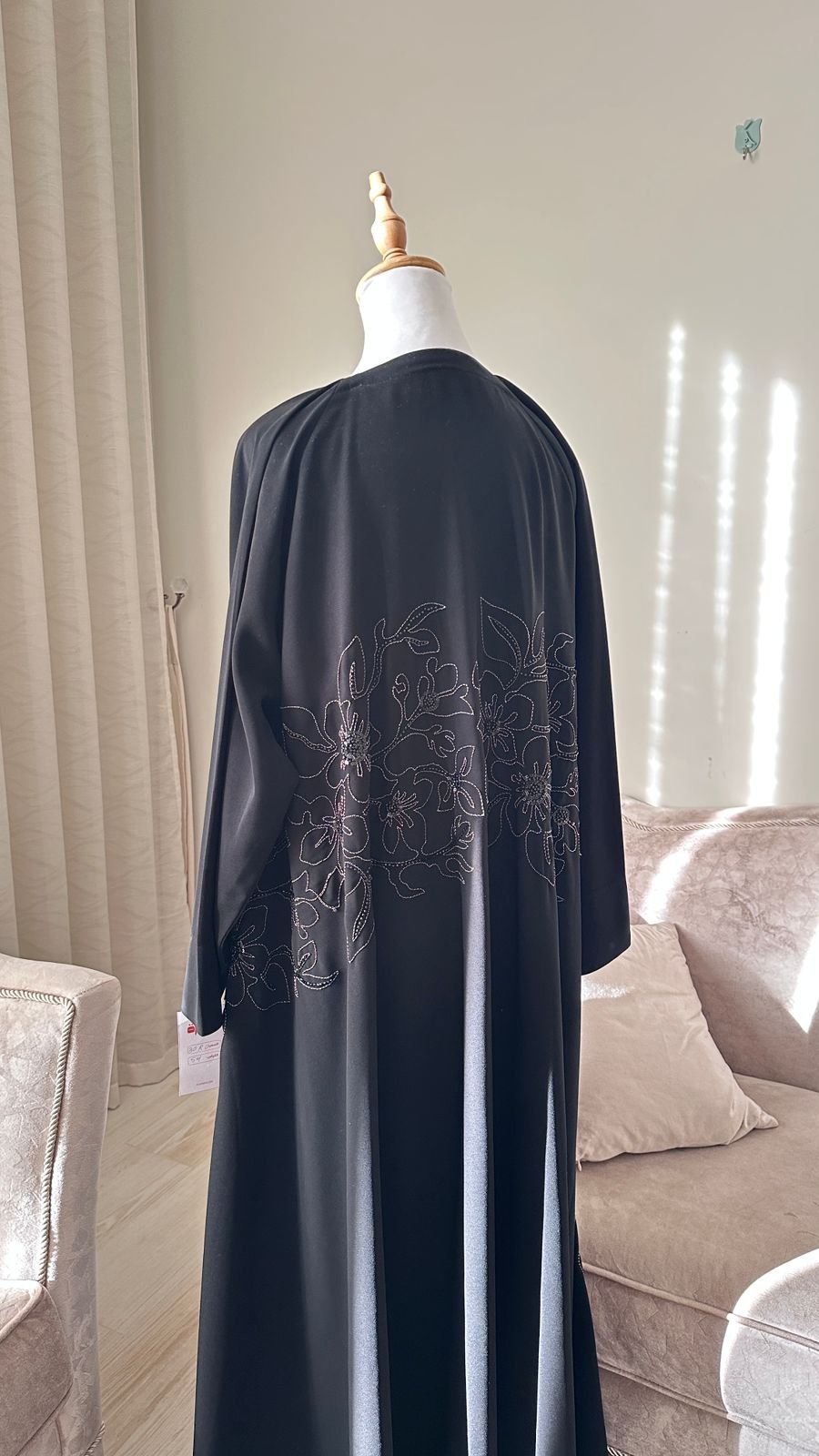 لمسة فنية: تطريز يدوي دقيق على الظهر والجانبين، يمتد بنقوش نباتية ناعمة مرصعة بخرز فاخر يلمع بخفة مع كل حركة.